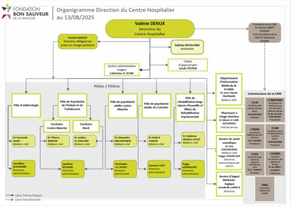 Le pilotage effectif de la politique générale de la Fondation est confié à une direction générale unique constituée d’un directeur général, d’une directrice générale adjointe et d’une cheffe de cabinet. Deux directeurs « métiers » : une directrice du centre hospitalier et une directrice des accompagnements médico-sociaux, assurent la gestion opérationnelle des établissements.